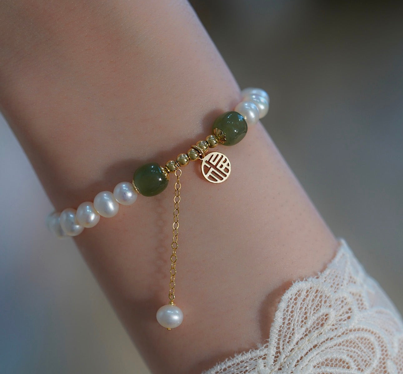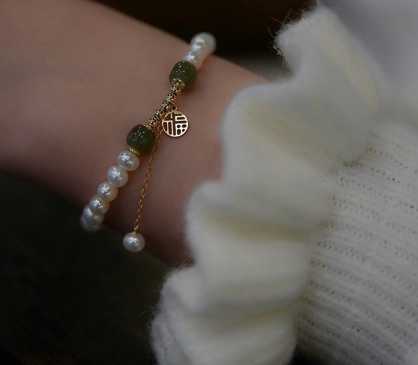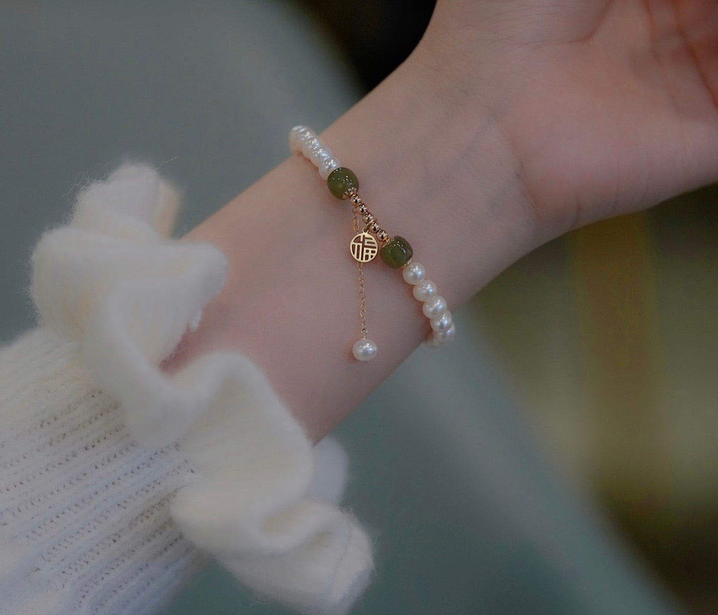 The Bracelet is a captivating piece that seamlessly blends the natural beauty of Hetian jade with the pristine charm of freshwater pearls, adorned with a small pendant bearing the Chinese character "福" (meaning "good fortune").It symbolizes the gathering of blessings from nature, as the wearer carries the essence of good fortune, well-being, and happiness. It's the perfect accessory for enhancing your daily attire and adding a touch of elegance to festive gatherings with friends and family.