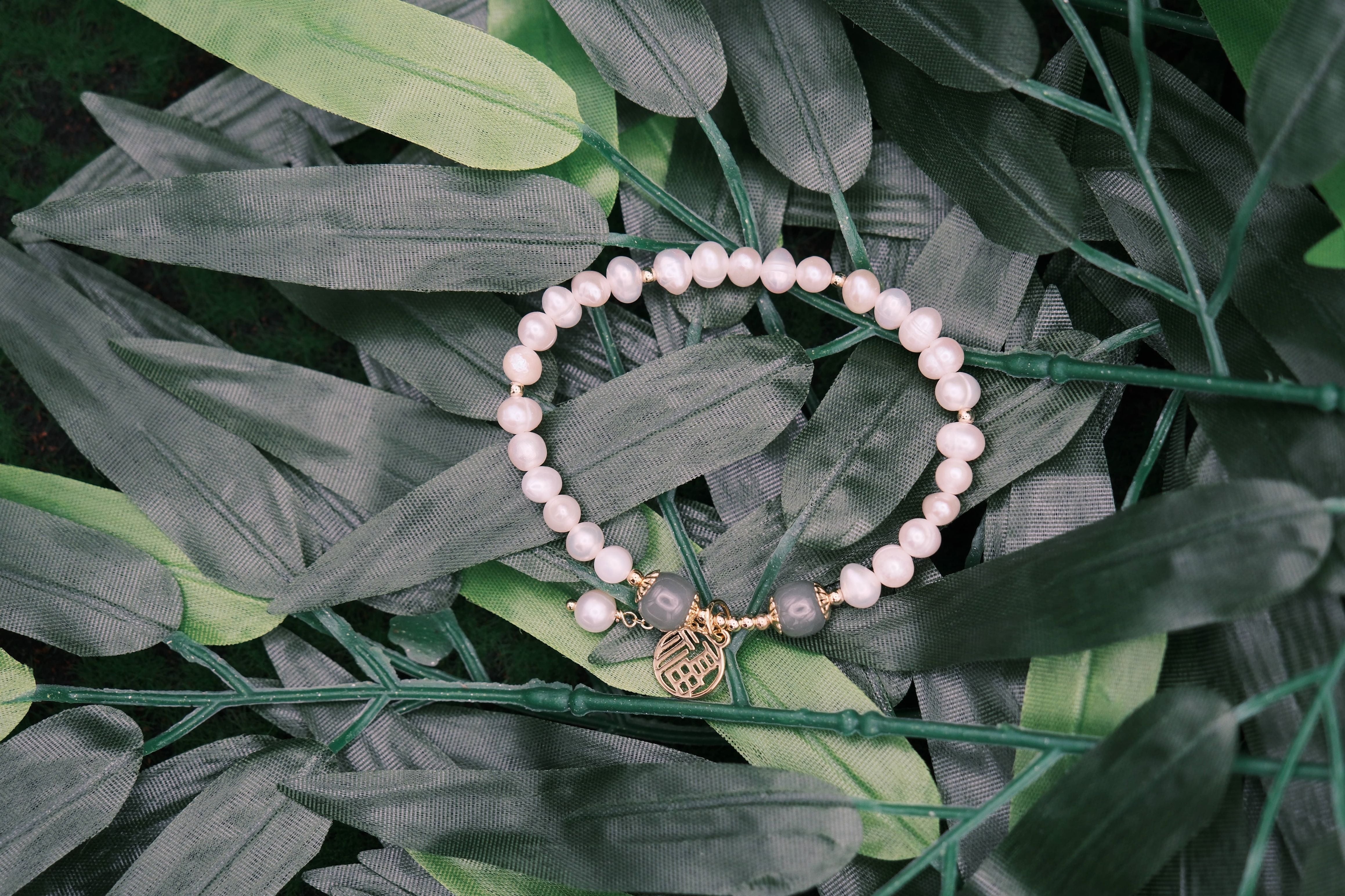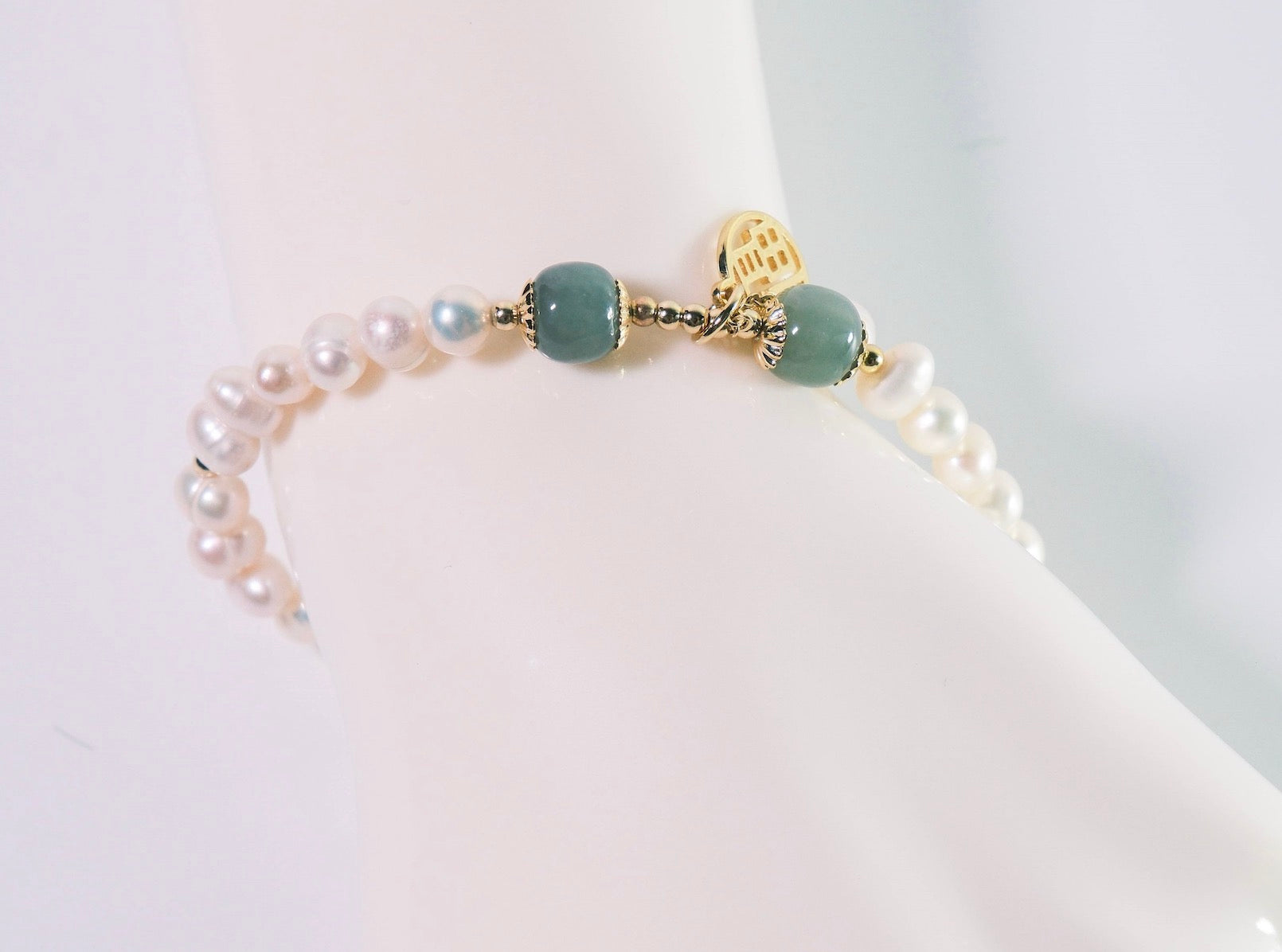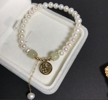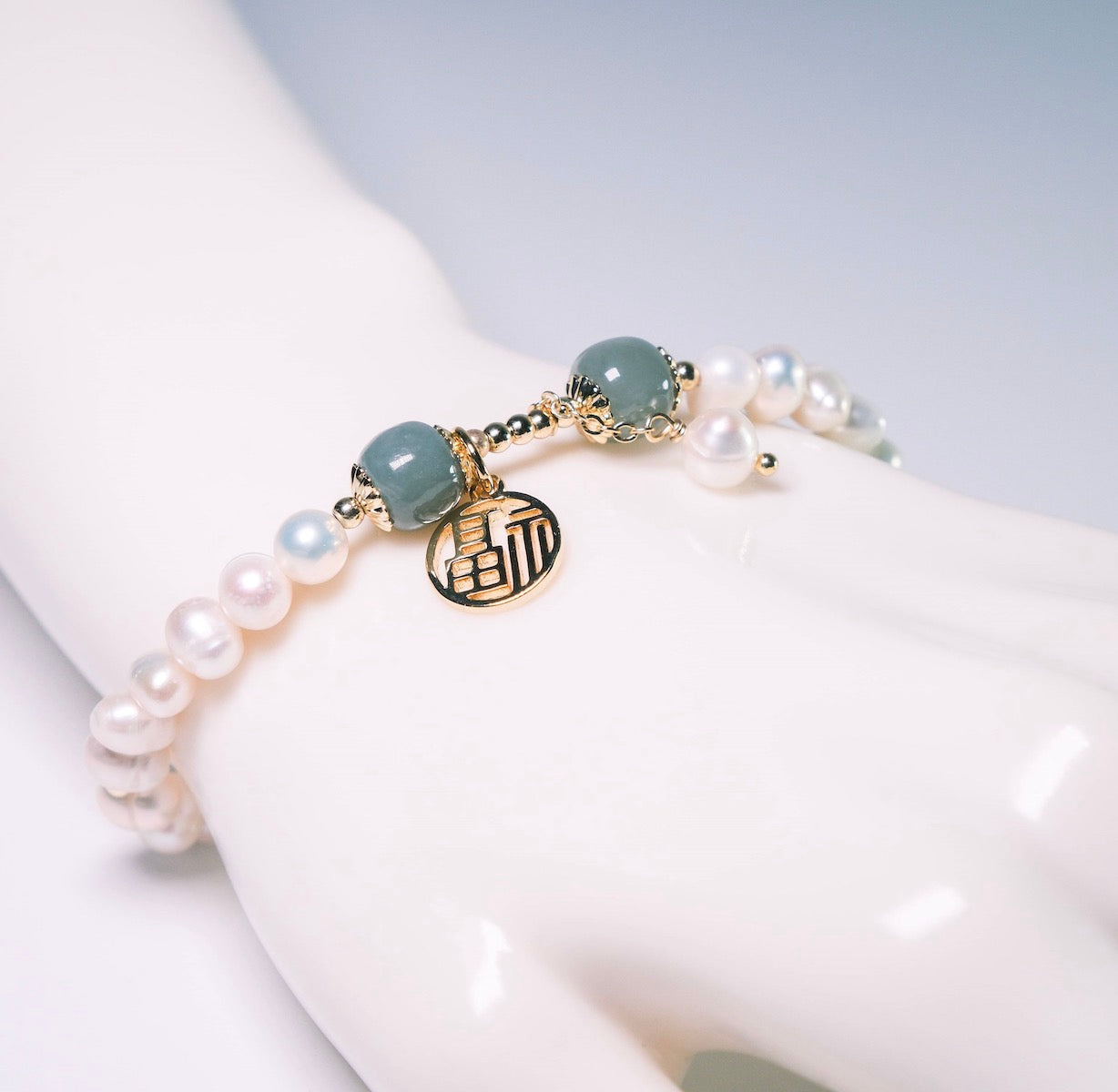 The Bracelet is a captivating piece that seamlessly blends the natural beauty of Hetian jade with the pristine charm of freshwater pearls, adorned with a small pendant bearing the Chinese character "福" (meaning "good fortune").It symbolizes the gathering of blessings from nature, as the wearer carries the essence of good fortune, well-being, and happiness. It's the perfect accessory for enhancing your daily attire and adding a touch of elegance to festive gatherings with friends and family.